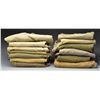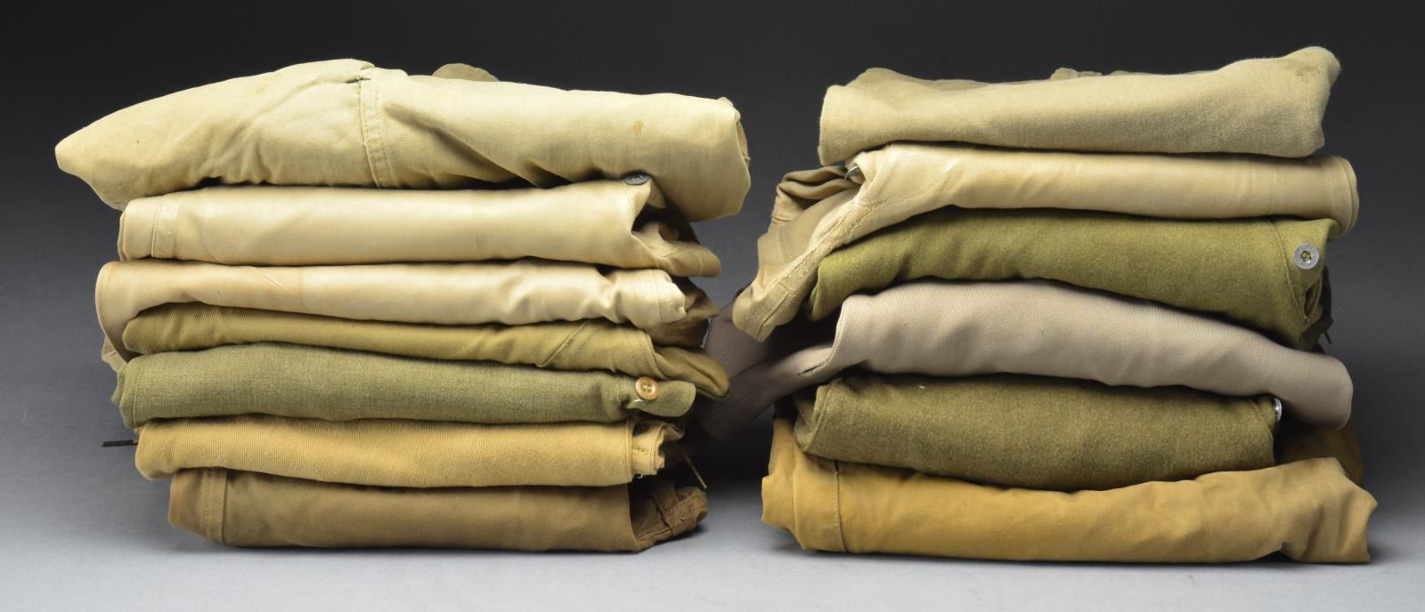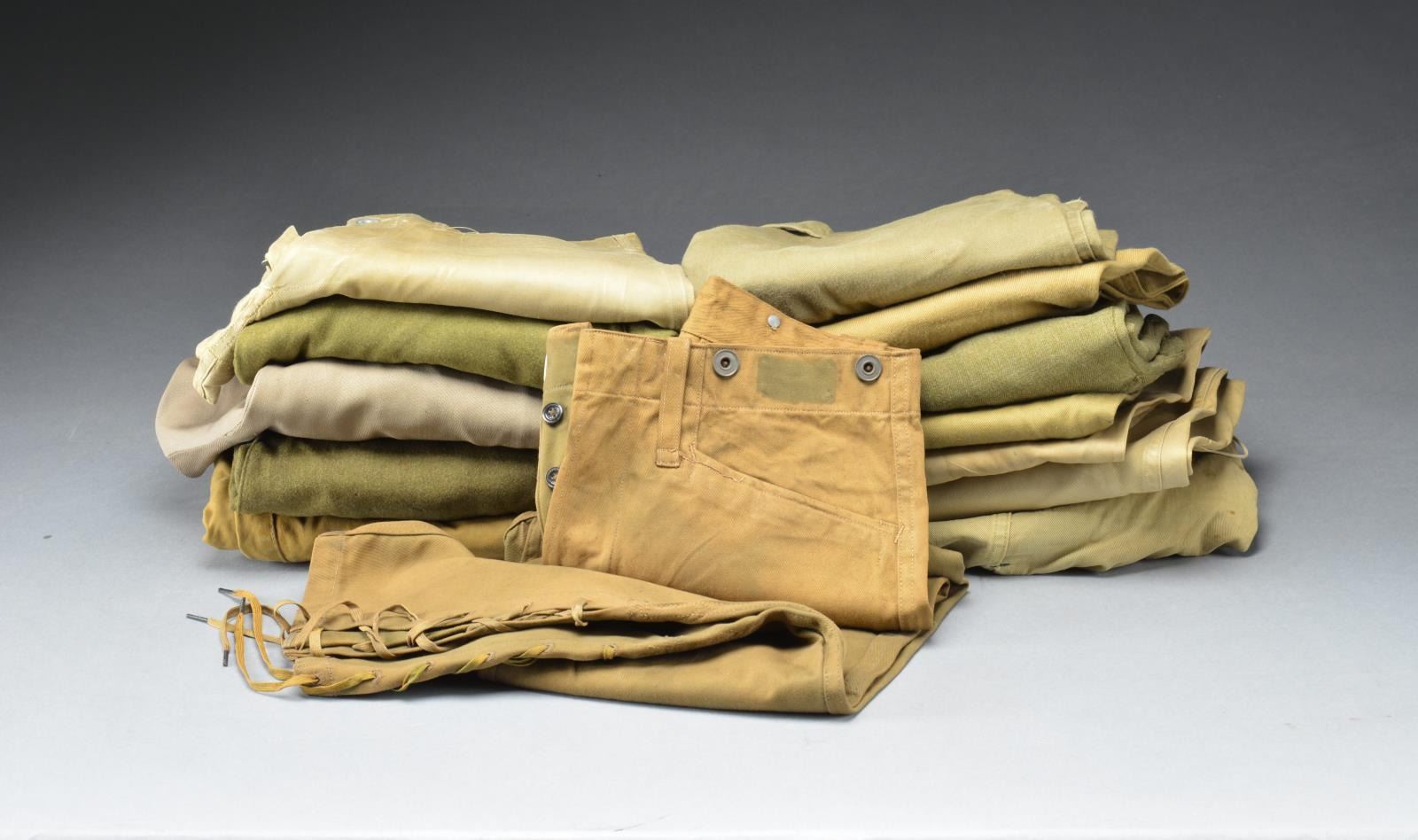 1) WWII UNIFORMS & PANTS. This uniform lot consists of a dbl. breasted, gray wool overcoat w/ an interior tag that reads, “REGULATION ARMY OVERCOAT WOOL” . / A WWII shirt for a Technical 1st Sergeant w/ Advanced Section Communications Zone patch of the ETO on left sleeve. / An Army Air Corps Ike jacket w/ Air Corps collar disks & 3 award sewn on ribbon bar. Left sleeve has a worn bullion Air Force patch. / An Ike jacket for a private w/ an Anti Aircraft Missile Command patch on the left sleeve. / The lot further includes 13 pairs of WWII military pants, mostly of various shades of green. Some have laced bottoms to fit into boots, other have straight legs. CONDITION: uniforms generally show light wear. Pants show light to moderate wear. (02-15725/BF).