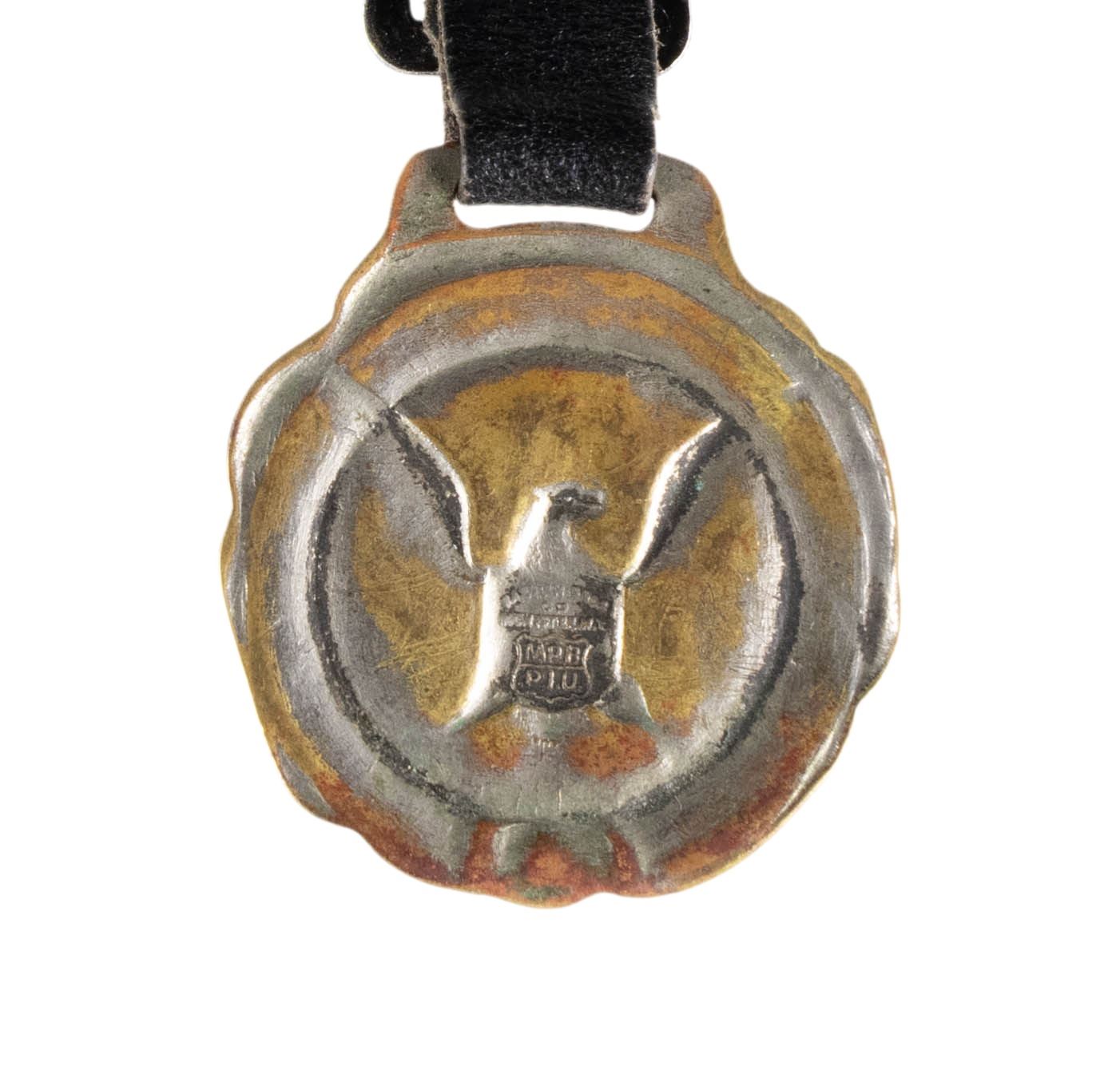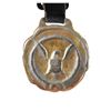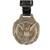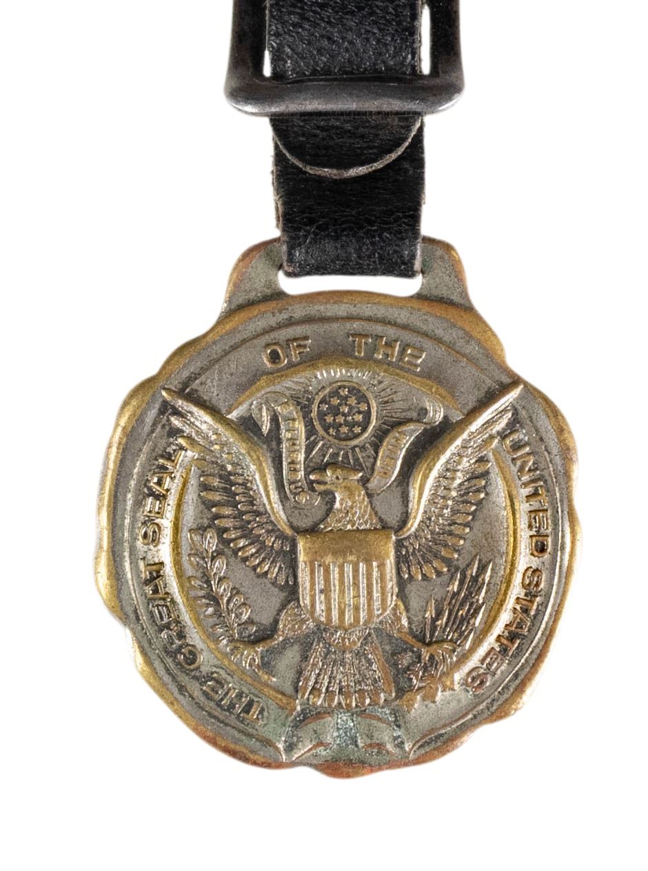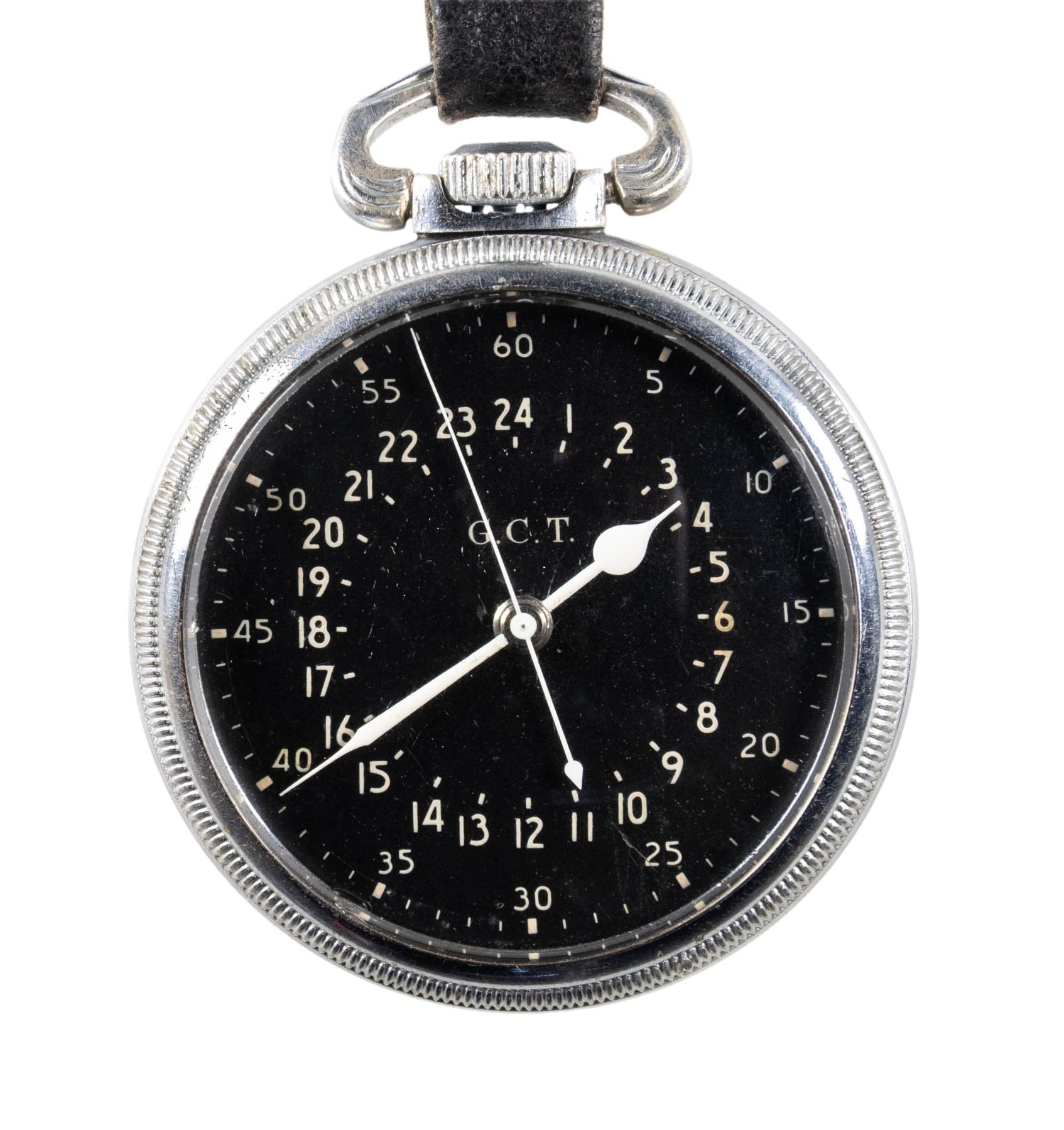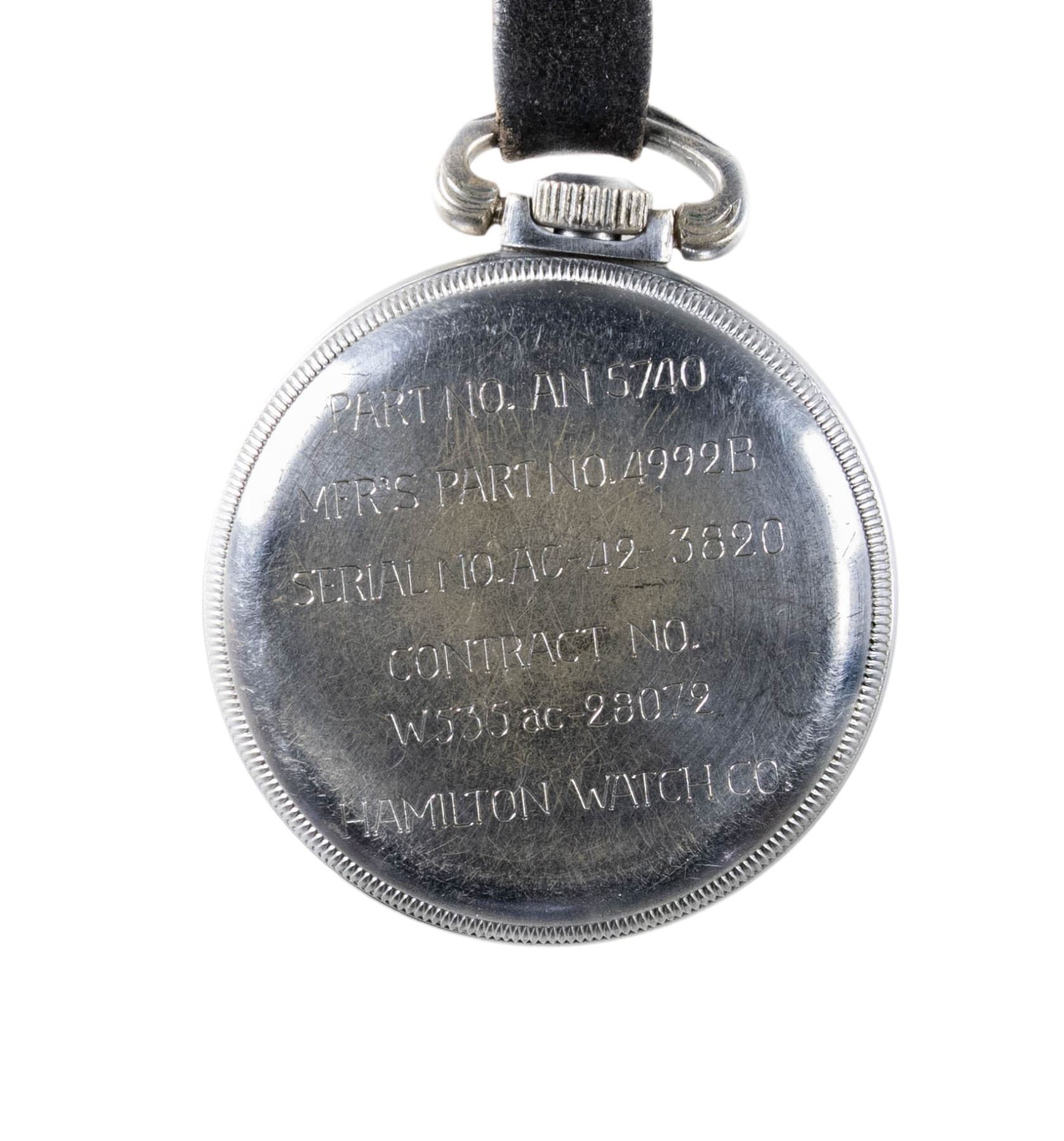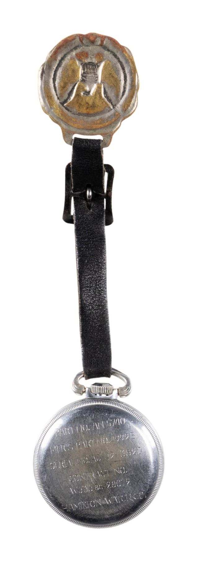 Diameter approx. 2". Black dial 24 hr G.C.T. watch, 22 jewel engine. Keystone coin finished case S# 001727 engraved on exterior "PART NO. AN 5740 / MFR'S PART NO. 4992B/ SERIAL NO. AC-42-8820 / CONTRACT NO. / W535ac-28072 / HAMILTON WATCH CO". Leather strap has medallion of United States Great Seal on front. CONDITION: watch appears to be functional with patina & scratches to case exterior. strap appears to be in good intact condition & sealed shows fading finish & mustard patina. (02-24235/MD). NON-GUN. $400-550.