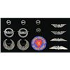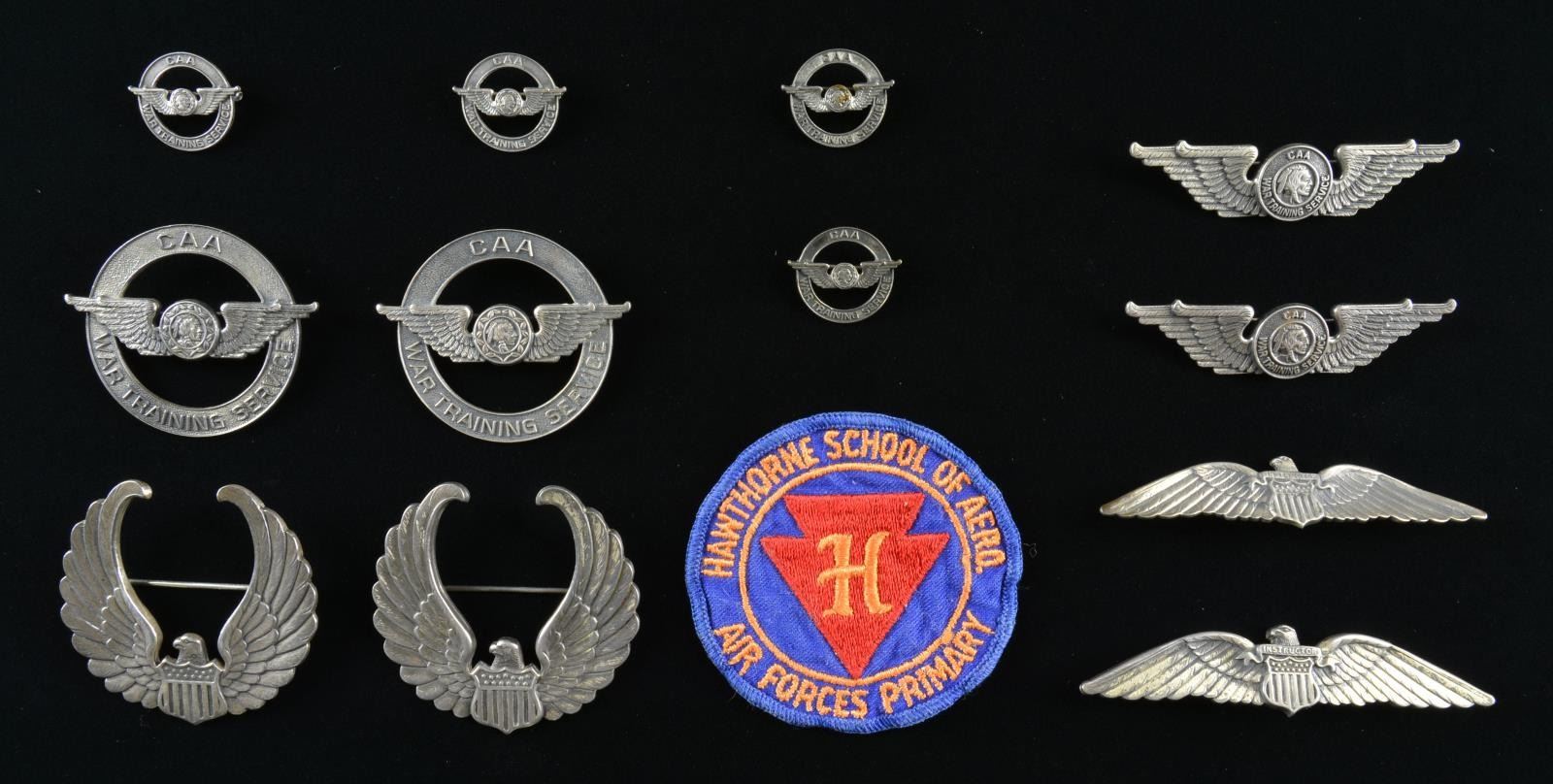 This group includes 1 Pilot Instructor wing approx. 3 3/4" in length. Unmarked sterling wing has illegible name scratched on the reverse. / 1 Pilot Instructor wing approx. 3 1/2" in length. Wing is marked on the reverse, “STERLING” 3 times. / 2 Pilot Instructor cap badges marked, “STERLING” on the reverse. / 1 Patch that reads, “HAWTHORNE SCHOOL OF AERO. AIR FORCES PRIMARY”. / 2 CAA War Training Service Pilot wings w/ “Buffalo Nickel” Indian in center. Wings are marked on the reverse, “PAT PEND STERLING”. / 2 CAA War Training Service Pilot cap insignia w/ “Buffalo Nickel” Indian in center. Border reads, “CAA WAR TRAINING SERVICE”. Reverse is marked, “STERLING PAT PEND.”. / 4 CAA War Training Service Pilot collar or overseas cap insignia w/ “Buffalo Nickel” Indian in center. Reverse is marked, “PAT. PEND. STERLING”. CONDITION: all insignia show light wear. PROVENANCE: Collection of Brian C. Pinkerton. (02-15448-6/BF). $800-1,200.