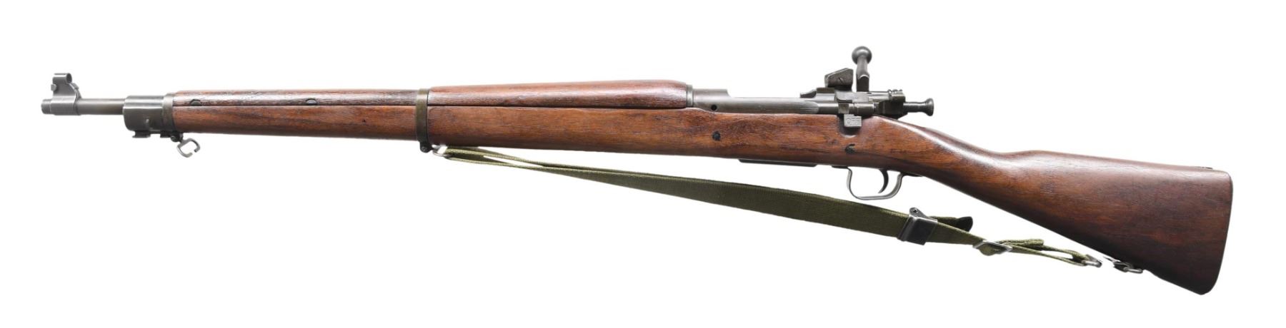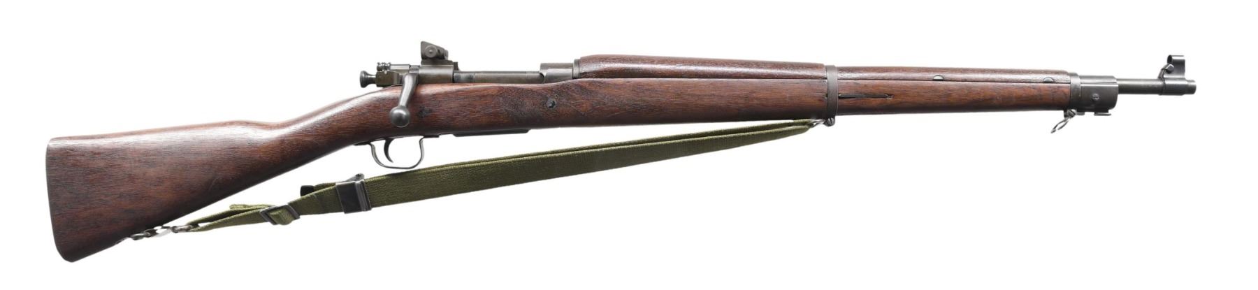 MILITARY RIFLE. Cal.30-06. S# 4826072. Bbl. 24" Marked behind front sight "SC flaming bomb 10-43". Adjustable aperture rear sight graduated to 800 yards. Blade front sight with sheet metal hood marked "US". Remington bolt assembly. All stamped furniture including fine checkered buttplate and Remington made large bow trigger guard. Straight grip walnut stock set. Markings are partly obscured due to arsenal rework finish at Ogden arsenal whose boxed "OG" appears on the cheek area. Green web sling. CONDITION: Stock set with its arsenal rework finish has light wear and handling marks. There is a loss of wood at the cutoff recess from sanding. Forend has deep scratches from improper removal of lower band. Metal retains a large degree of its arsenal refinish Parkerization with light wear. Very good shiny 4 groove bore. (24-5339/RW). CURIO. $800-1200.