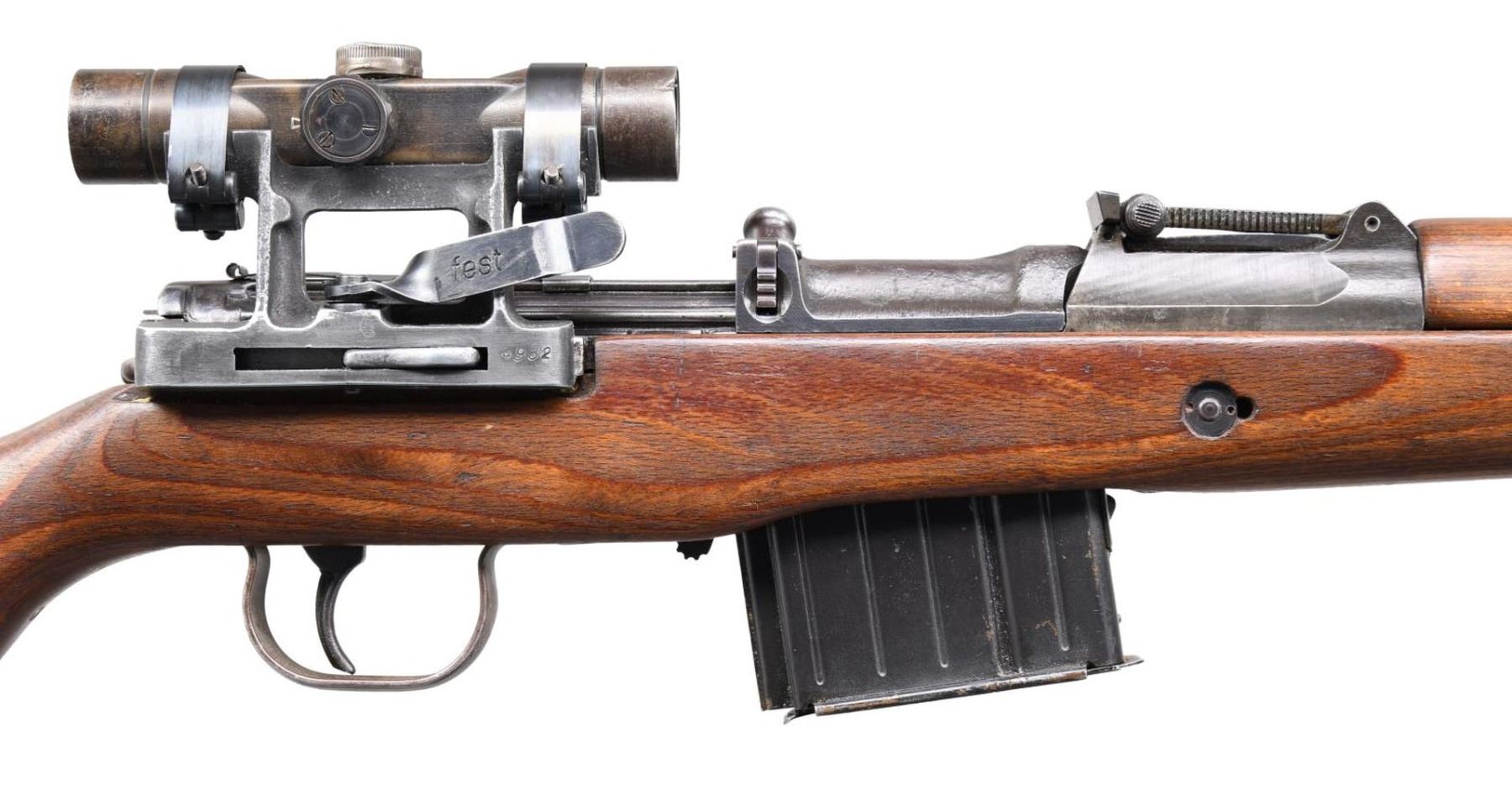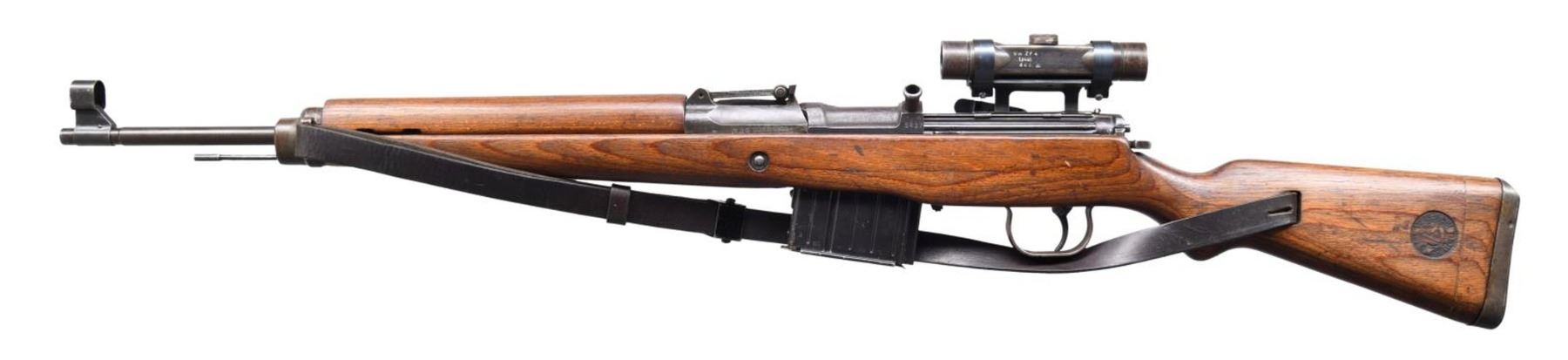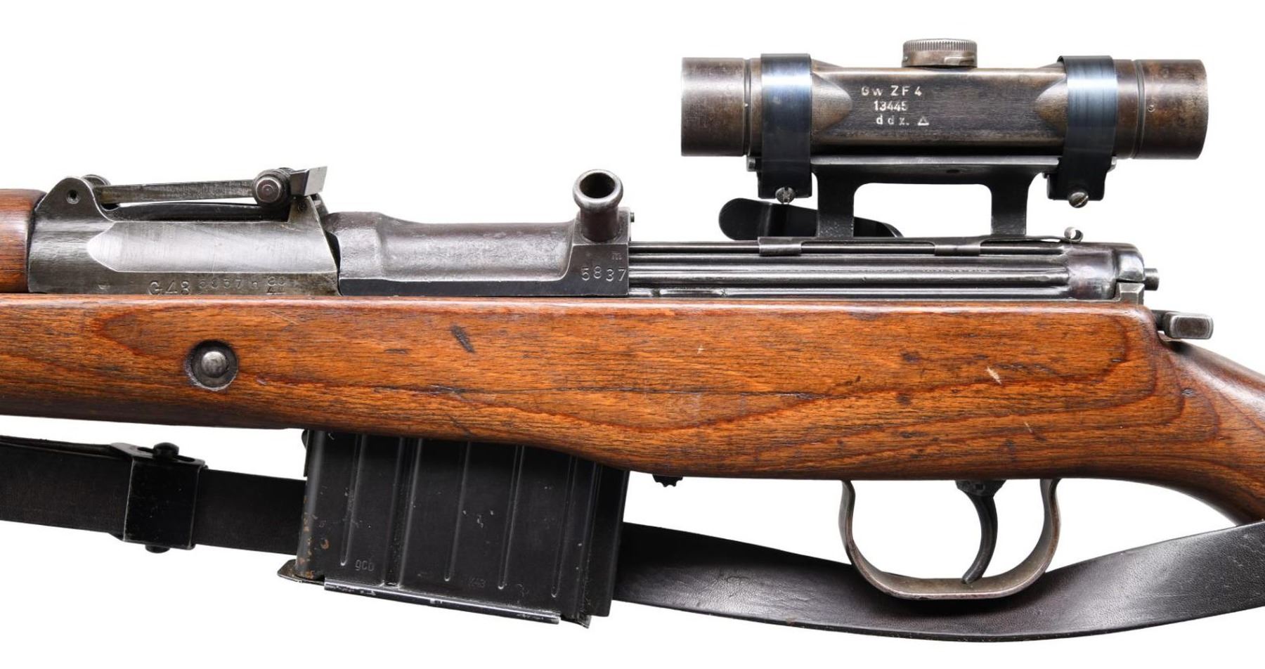 Cal. 8mm Mauser. S#5837n. Bbl. 21 3/4". Blade front sight with protective hood. Tangent rear sight graduated to 1200m. Rifle is also equipped with a ddx-coded ZF4 scope and repro mount. The mount is numbered "4932" and has a "WaA135" marking. Scope rail appears to be grounded to accept the repro mount. Mount lever is loose. Scope has post-reticle and fair optics. Left side of the rear sight base is marked with "G43", serial number, and "ac44", denoting a 1944 Walther mfg. Blued and phosphate finishes. Stamped matching numbers on the bolt carrier and stock. Bolt body is mismatched. Matching electropencil numbers on the locking lugs and firing pin housing. The gas piston has an electropencil number that is hard to read. Piston is also not moving and may require attention to fix. Bolt housing shows heavy wear at the rear and chipping on the grooves. Laminated stock set with left side sling provisions and a black leather sling. Buttstock has a 1" splice repair at the rear, and the left side of the butt has an unusual round brand marking that is likely post-war. Waffenamnts on stock are present but faint and indiscernible. A cleaning rod is present. MAGS: 1-10 rd. repainted and coded "gcb". CONDITION: stock set appears sanded with an added dark finish, a 5" crack ahead of the mag. well, a few other laminate cracks, an added hole ahead of the recoil lug, some chipping around the buttstock repair, scattered dings, and handling wear. Metal has mostly faded to gray with some oxidation, dings, and traces of original finishes. Good-plus, bright bore with some light pitting and frosting but strong rifling. PROVENANCE: from the collection of Joel Thone. (24-1519/MJC). CURIO. $2,000-3,000.