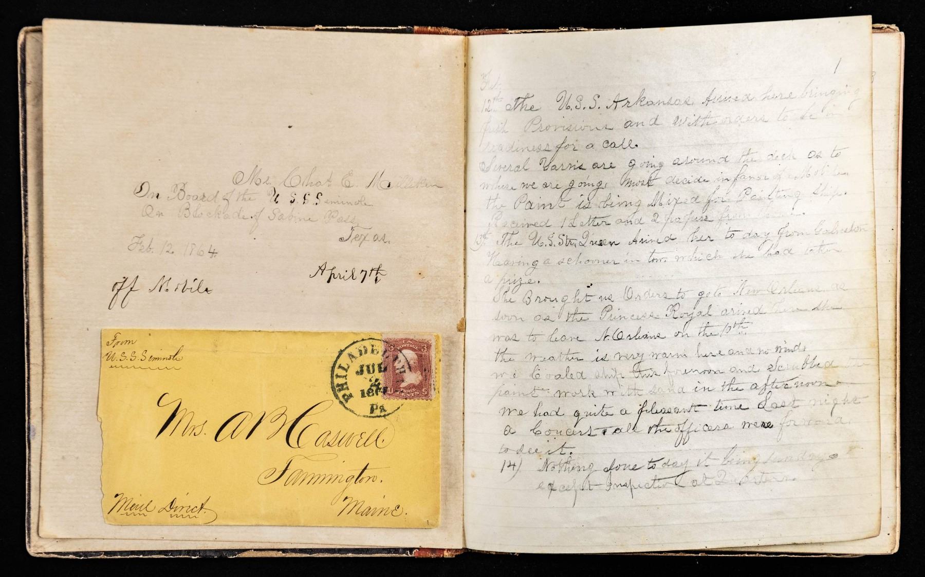 DEATH, USS SEMINOLE, MOBILE BAY. Large 8" x 7" bound diary has over 80 pages filled out in pencil or ink, day by day along with a few transcribed poems. CHARLES EDWIN MILLIKEN (1848-1864) had just turned 16 when diary begins Feb. 12, 1864 on blockade of Sabine Pass, Texas , April 7, 1864 the USS Seminole was off the coast of Mobile, young Milliken was good writer & detailed accounts. He was only 14 years old when he enlisted. His last entries August 23-"..our boat left the ship for the fort & I went in…. 2 o'clock Fort Morgan is ours and our flag waves over her in triumph. I went down to the fort with the officers for trophies. I got a musket… Aug 24 the day is pleasant..the army can be seen marching into Ft Morgan ..waving the STAR SPANGLED BANNER. The Selma came along..the Monitor Manhattan got up to the house, the ship's company was to sleep in…..The USS Queen came inside to say the oyster man was alongside again today…This was last entry, Aug 25 as he was on duty that day removing "torpedoes" in Mobile Bay, when one exploded killing Milliken and 4 other seamen, 6 seriously wounded, 3 slightly wounded. He would be buried the next day at Fort Morgan. UNATTACHED ACCESSORIES: binder of research and transcription of diary. CONDITION: diary is very good, complete and easily read. (02-26293/JS). NON-GUN. $1,500-2,000.