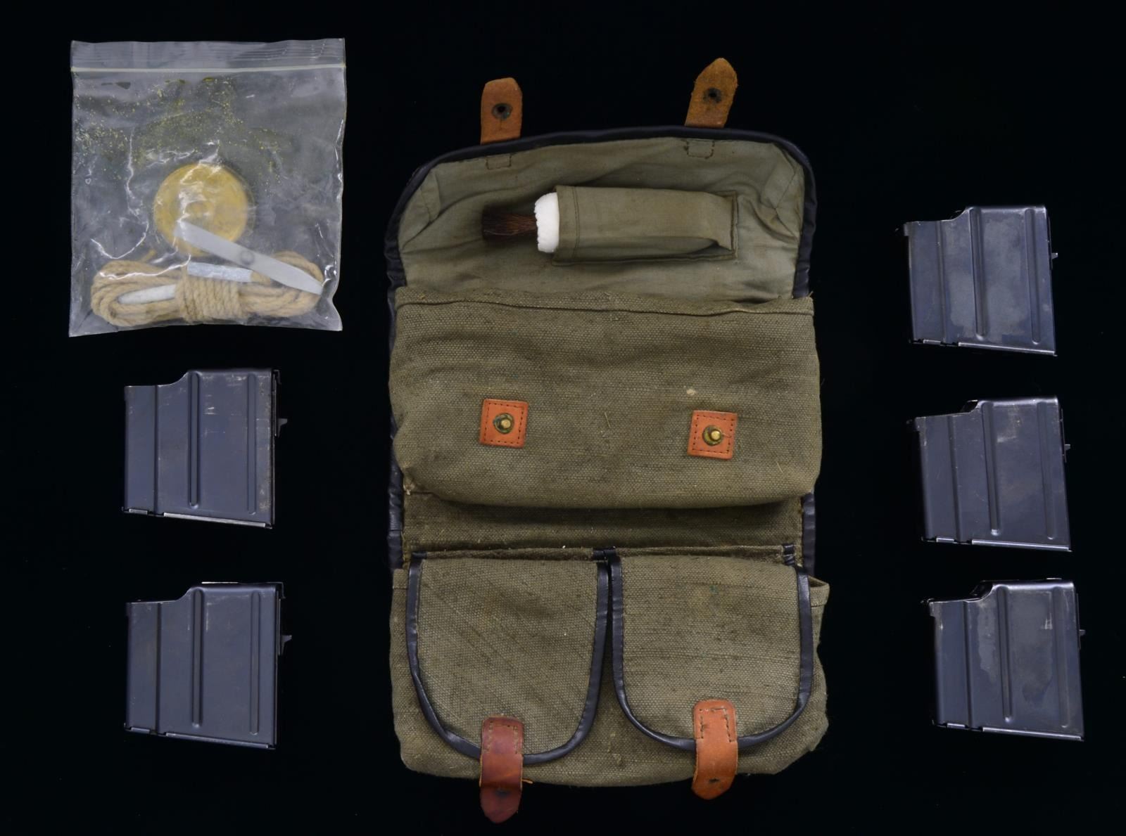 This lot consists of 5 Yugo M76 8mm Mauser 10-rd. mags, cleaning kit & carrying pouch. CONDITION: 4 mags are in wrapper w/ grease. One mag is unwrapped but in very good plus condition. Case shows staining & wear from years. (02-16810-8/MJC). $100-200.