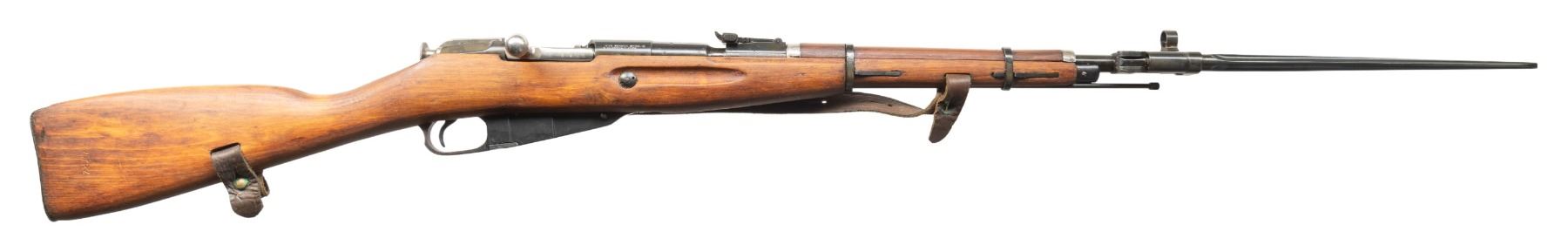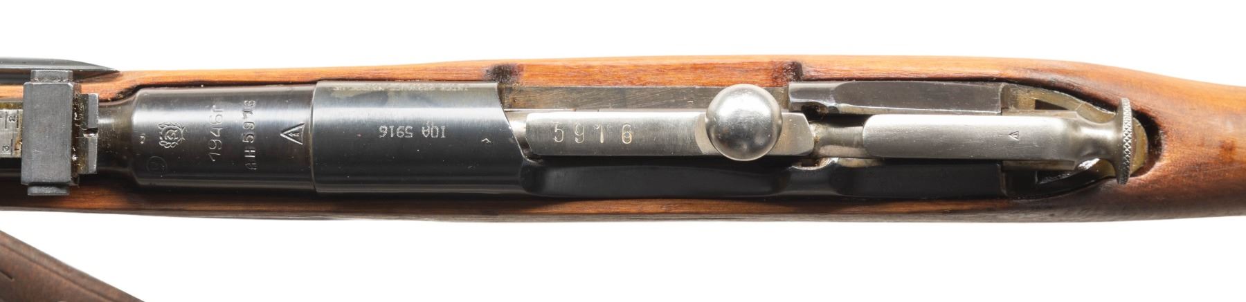 Cal. 7.62x54R. S# IOA5916. Bbl. 20 1/4". Standard M44 sights. All visible matching numbers with buttplate & floorplate being force matched. Soviet M44 Mosin Carbine reworked by Communist Yugoslavia. Bbl. shank has Izhevsk markings & 1946 date. Receiver has IO Inc. import marking & importer added serial number. Arsenal rework blue finish. Folding spike bayonet present. Hardwood stock set with "TRZ" Yugo arsenal stamp, bottom mounted sling slots & leather sling. Cleaning rod present. CONDITION: arsenal refinished stock set shows some finish loss, dings & handling marks. Metal retains 95% arsenal rework blue with some dried grease on receiver, handling marks, edge wear & light oxidation. Action functions properly when hand cycled. Bright near excellent bore. (25-4773/MJC). CURIO. $400-600.
