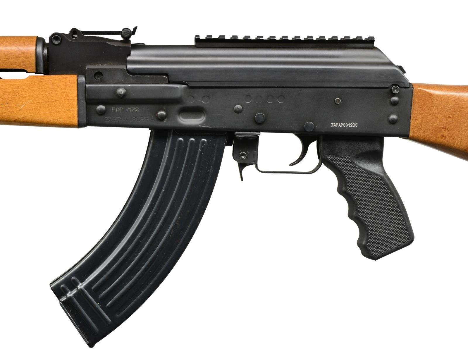 Cal. 7.62x39. S# ZAPAP001220. Bbl. 16”. Serbian sporting rifle variant of the popular AK-47. Hardwood furniture. Black painted finish on all exposed metal surfaces. Protected post front sight. Tangent style rear sight graduated to 1,000 meters. 5.75" Picatinny rail fixed to top cover. Plastic pistol grip. Sling swivel on left side of gas block. Import marked “C.A.I. GEORGIA” on right side of receiver. Permanently attached slanted muzzle brake. Lever actuated bolt hold open device. MAGS: 1-30 rd. metal. CONDITION: bbl. shows a few minor handling marks. Left side of stock at toe shows series of sm. compression marks. Remainder of exterior appears to be well maintained. Bore has strong rifling w/ areas of light pitting in grooves. Action appears to function correctly when cycled by hand. (20-360/JZ). MODERN. $500-800.
