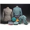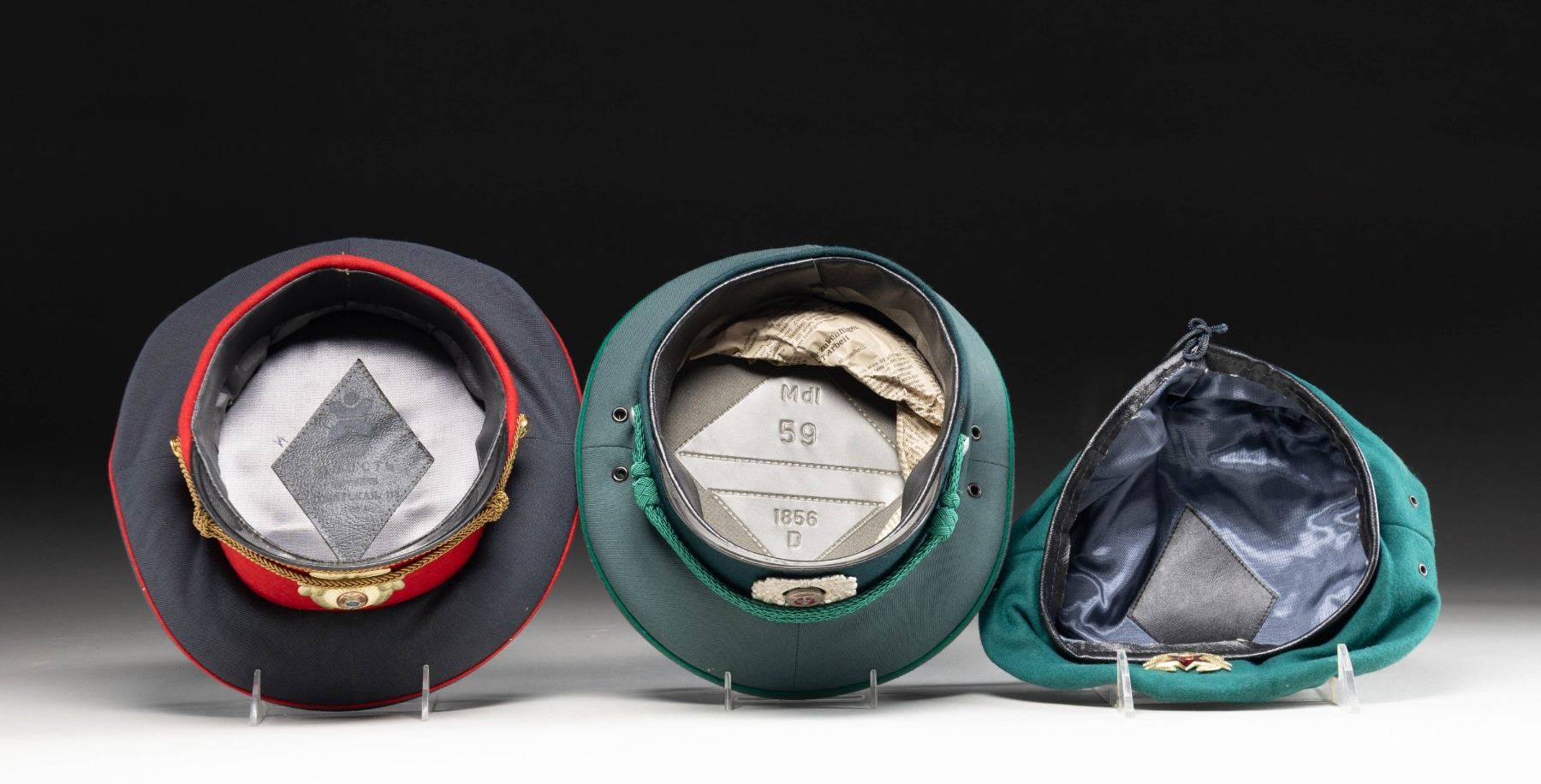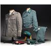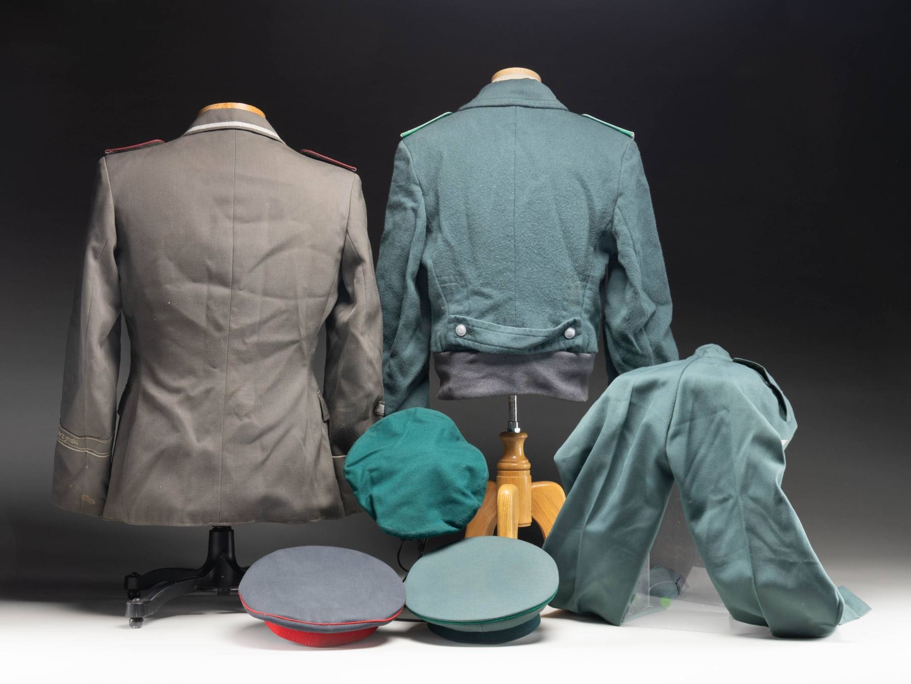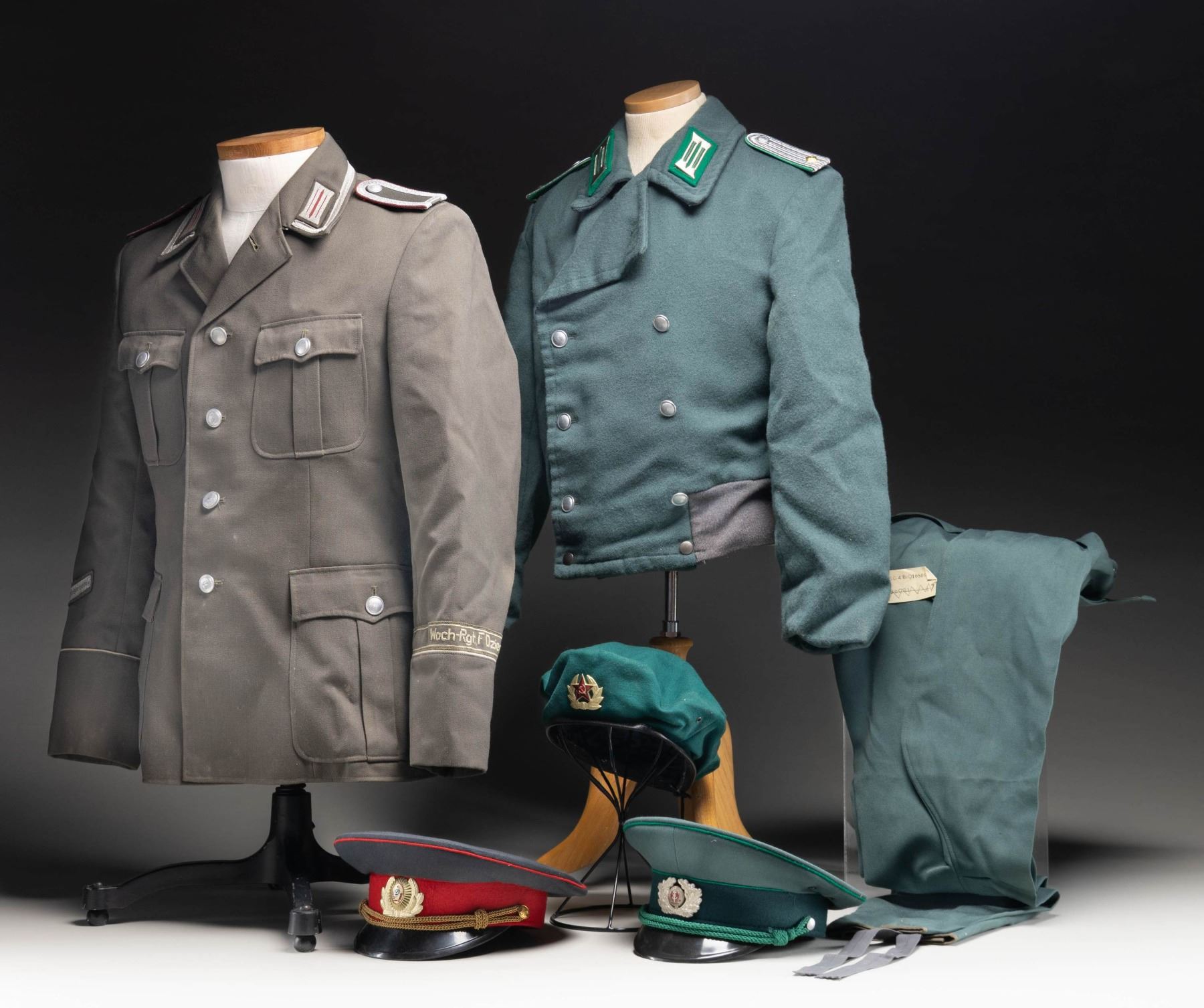 This lot contains 1 East German green wool double breasted jacket for a 1st Lieutenant with green backed collar tabs and shoulder boards, 1 Pair of wool / polyester blend green pants, 1 Brownish green tunic for a sergeant with burgundy colored highlights on the collar tabs and backing on the shoulder boards featuring a cuff title the reads "Wach-Rgt, F Dzierzynski", 1 Enlisted visor cap with green piping and chin cord, and 1 Russian officer's visor cap with red band and piping. CONDITION: all items show light wear. (02-025328/BF). NON-GUN. $200-300.