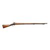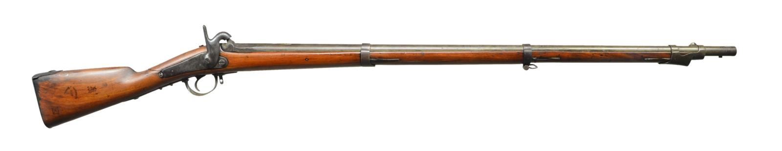 Cal. 69. S# NSN. Bbl. 40.5”. Belgium made model 1857 French pattern that shot large rifled projectiles, the French triangle base minié ball often excavated in Confederate areas would be proper ammunition. These were published in early texts as being made or sold by Tanner of Bastrop, Texas, but there is no connection. Regardless, these import muskets among the tens of thousands scoured up by Confederate agents in early war buying all European obsolete longarms available. Standard configuration, iron mounted, backaction lock marked “TANNER & CIE / LIEGE”. CONDITION: fair overall, missing rear sight, ramrod & rear sling swivel. Stock broken at wrist with poor old repair. Mechanics works, will cock & fire, dark rifled bore. (01-22949/JS). ANTIQUE. $700-900.