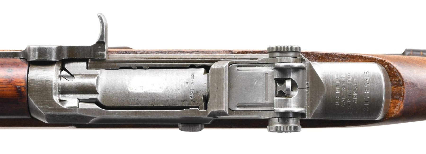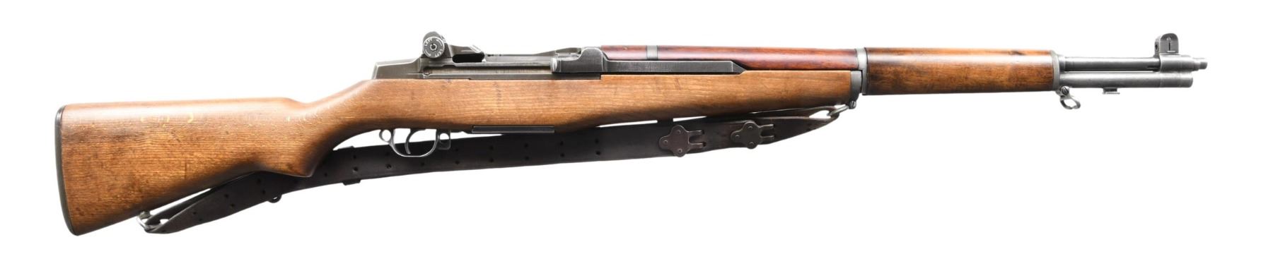 RIFLE. Cal. 30-06. S# 3078545. Bbl. 24". Barrel is marked on the right side "S-A-6-50". Throat gauges 2.0. Muzzle gauges 4.0. T105E1 aperture rear sight. Blade front sight with protective ears. Bolt has had steel lot numbers removed by grinding leaving the balance of the markings visible. All major parts markings are "SA". Milled trigger guard. Buttstock is hardwood replacement and retains a Danish data tag in the barrel channel. Rear handguard is likely original walnut and front handguard appears to be European walnut. Well worn military brown leather sling marked "-44-". UNNATTACHED ACCESSORIES: early type slotted combination tool in butt. CONDITION: stock set has a lightly worn arsenal rework finish with small scattered handling marks. approximately 2" crack in front handguard. Metal has turned an overall grey with moderate wear and handling marks. Very good shiny bore. (24-5812/RW). CURIO. $1,000-1,500.